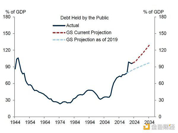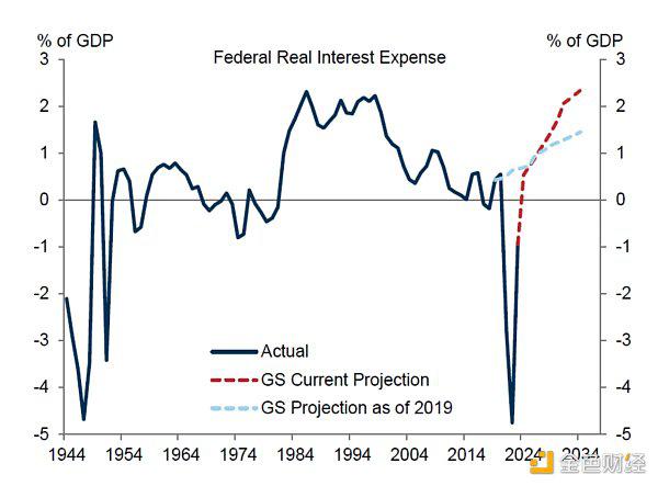 持续关注美国的财政状况,基本上每年都会作为主题炒作一次,如下图所示,美国政府的债务十年之内就可能达到GDP的130%,且光利息支出就将达到GDP的2.4%,维持美国全球霸权的军费支出才3.5%,这显然不可持续。