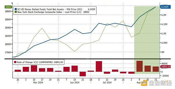 尽管全球股市回暖+资金流入,低风险偏好的货币基金市场也连续四周流入,总规模升至6.24万亿美元,再刷历史新高,可见市场流动性依旧非常充裕: