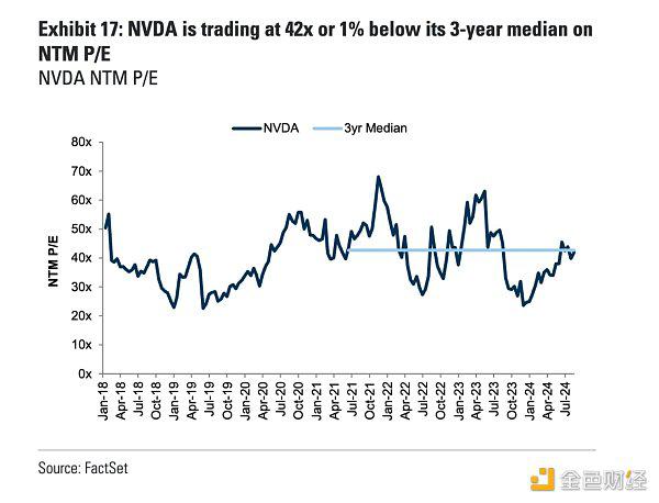 NVDA当前的估值水平基本位于过去三年中值水平,不高不低