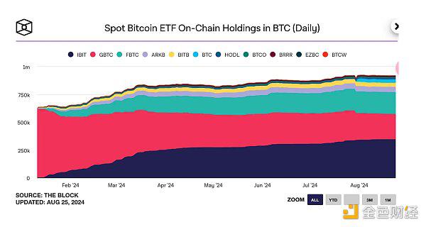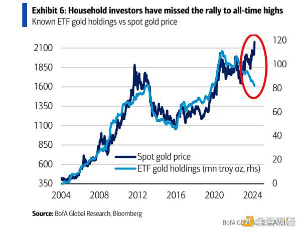 从下图可以看到大饼 ETF的流入速度在4月份以后就显著减慢了,以大饼本位,最近5个月总共才增长了10%,这与其价格在3月份见顶是相匹配的,如果无风险收益率下降,可能会吸引更多投资者进入黄金和大饼市场这是非常有可能的。