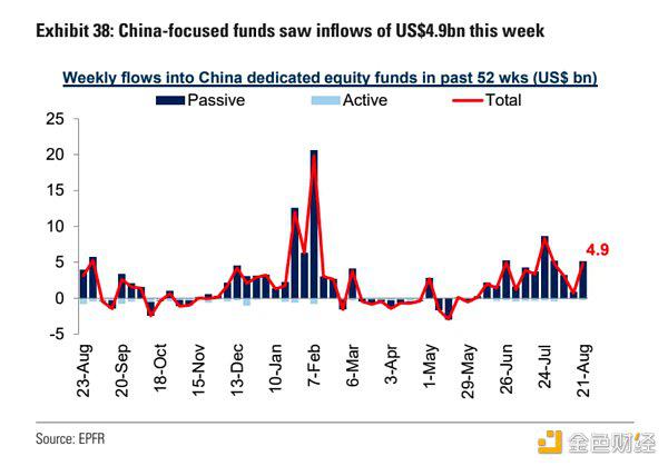 中国股市一直跌,但中国概念的基金一直在净流入,这周净流入49亿美元创下五周来新高,连续第12周净流入,对比其他新兴市场国家,中国也是流入最多的。敢于选择在当前市场下行中逆势加仓的,不是国家队就是长线资金吧,赌你只要股市不关停,最终会涨回来’
