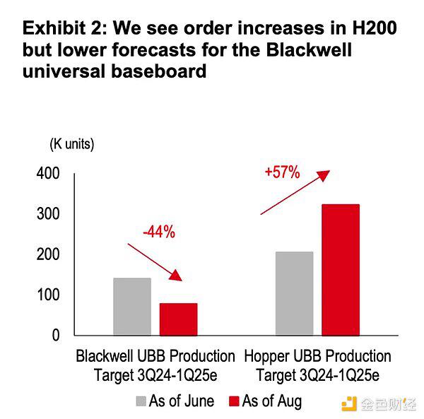 根据HSBC的预测,B100/B200 基板(UBB)的生产已经修正了 44%,尽管交付可能部分推迟到 2025 年上半年,导致 2024 年下半年出货量减少,然而,H200 UBB 订单显著增加,预计在 2024 年第三季度至 2025 年第一季度增长了 57%。