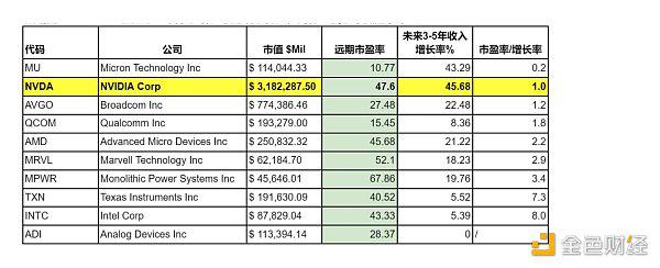 NVDA和竞争对手对比下市盈率绝对不低,已经达到了47.6倍,但是由于仍然保持了较高的增长预期,所以所谓的PEG ratio 也就是市盈率除以增长率的结果仍然在同行里属于最低的水平之一: