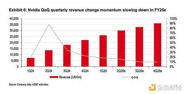 市场共识预期2025财年收入是 1056 亿美元,对比去年是609亿美元,增速由去年的126%放缓至73%。官方guidance Q2收入是280亿美元,市场预计会更乐观一些,但本季业绩增速将从2x%的增速区间进一步放缓至1x%的增速区间: