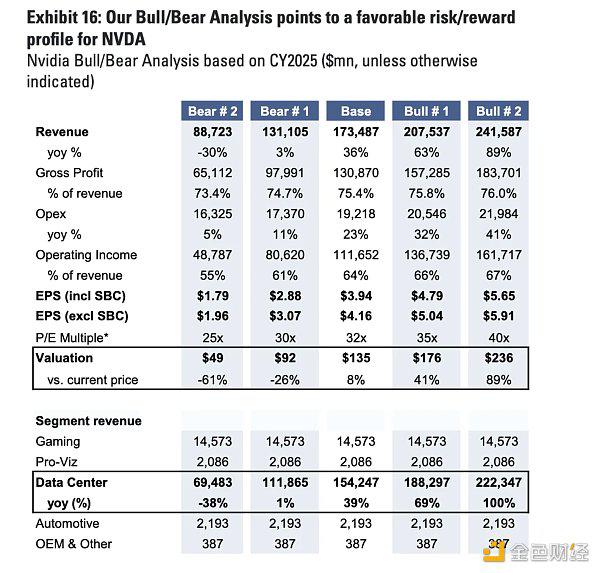 即假设数据中心收入在2025年下滑至690亿美元,比当前水平低38%,比基线预期低55%,作为“最悲观”情景的假设。然后以2025 数据中心收入增长达到100%作为最乐观假设。