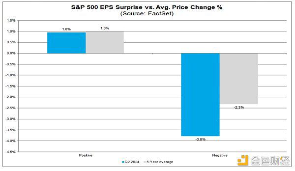普500中93%的公司已公布实际结果,其中79%的公司EPS超出预期,60%的公司营收超出预期。超预期公司的股价表现与历史均值基本持平,但逊于预期的公司股价表现要差于历史均值: