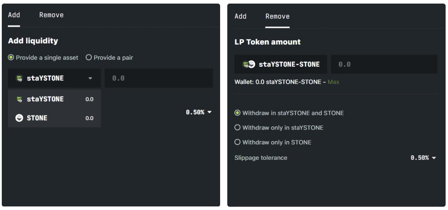以 Scroll 上推出的 STONE 基金产品为例,STONE 基金已获得超 1.9 亿美元资金参与,这是 Tranchess 和 StakeStone 合作推出为期六个月的基金,主要包括 stoneQUEEN、turPSTONE、staYSTONE、staYSTONE-STONE LP。其中,用户可将 STONE 按照 1:1 的比例创建 stoneQUEEN 来获得 1 倍积分,也可将每枚 stoneQUEEN 进一步拆分为 0.1 枚 turPSTONE 和 0.9 枚 staYSTONE 来获得 2 倍积分。其中,turPSTONE 相当于 Turbo 代币,有着 10 倍固有杠杆率以及 StakeStone 额外奖励的 2 倍积分加成,因此持有者可获得 20 倍的 StakeStone 积分(注:基金到期后代币持有者可以根据到期时的净值按比例换回底层资产(包括 STONE),故该数字均为到期日时的大约净值。在这之前,用户可以通过 swap 把 Turbo 或 stable 换回 STONE,这个过程则按照网页显示的市场当前交易价格兑换。QUEEN 的兑换比例始终是 1:1。下同);staYSTONE 为固定收益的 Stable 代币,持有者可获得固定的 6% 年化利息(基金到期后,根据其净值,约可兑换回 1.0149 STONE),不获得任何积分。而 staYSTONE-STONE LP 持有者可获得一篮子收益,包括 CHESS 奖励、0.05% 手续费费率、利息以及积分成数(2 倍),持有者可随时以单币种或者双币种添加或移除流动性。