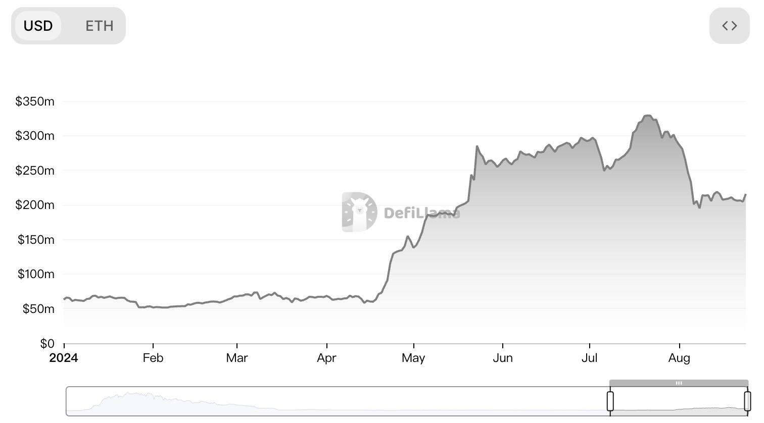 亮眼的增长数据展示了 Tranchess 的强势竞争力。DeFiLlama 数据显示,截至 8 月 24 日,Tranchess 的 TVL 已超过 2.1 亿美元,在 Scroll 上排名第二,今年涨幅高达 241.9%。