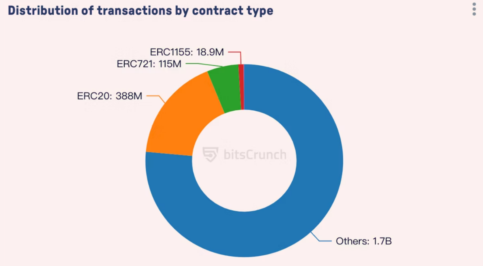 在所有游戏合约地址中,ERC20 Token 最为常见,其数量是 ERC721 Token 的三倍多。ERC1155 Token 则最少,约有 1,890 万个实例。