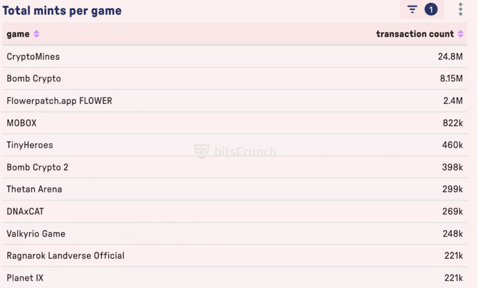 CryptoMines 在资产铸造量方面领先,约有 2,480 万个 NFT,其次是 Bomb Crypto 和 Flowerpatch。