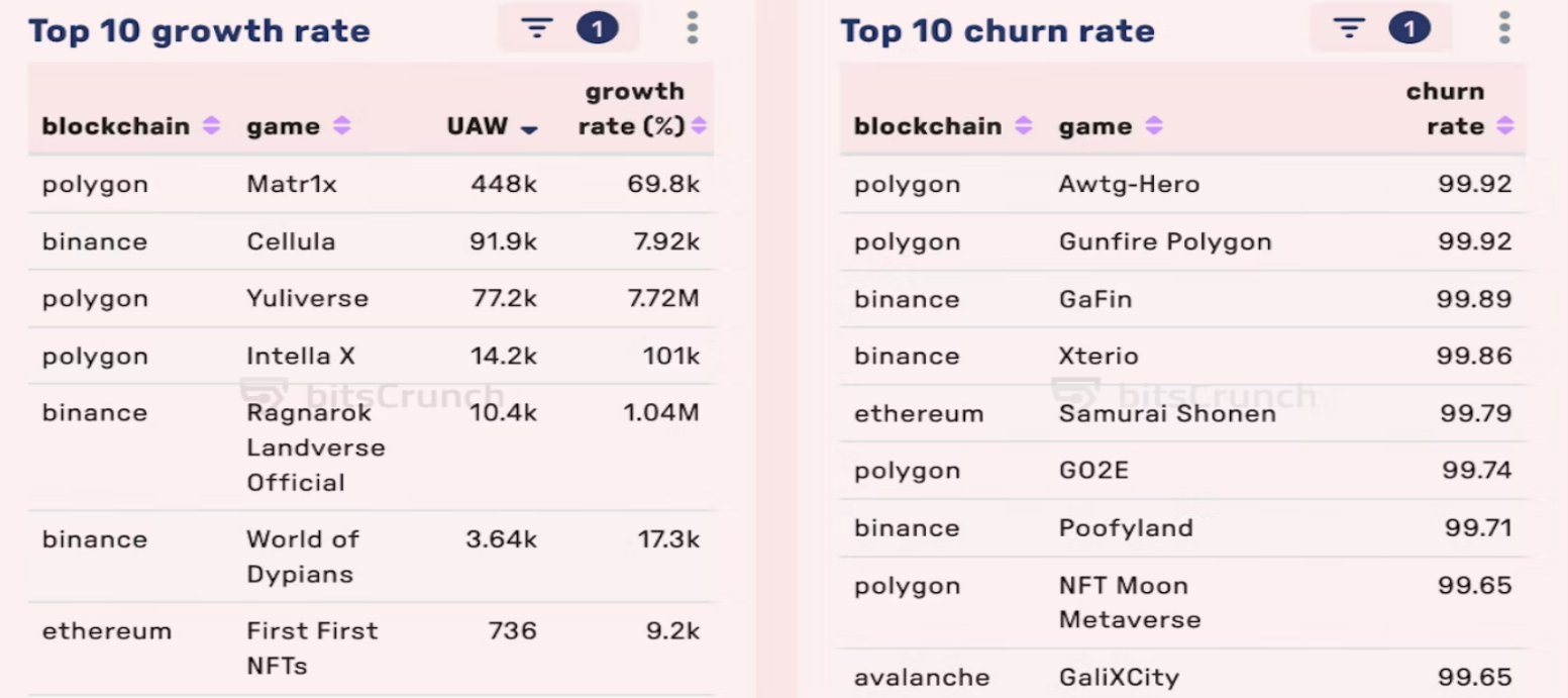 在过去的六个月里,一些游戏表现非常出色,例如 Matr1x、Cellula 和 Yuliverse。它们的活跃独立钱包数量名列前茅,用户参与度非常高。