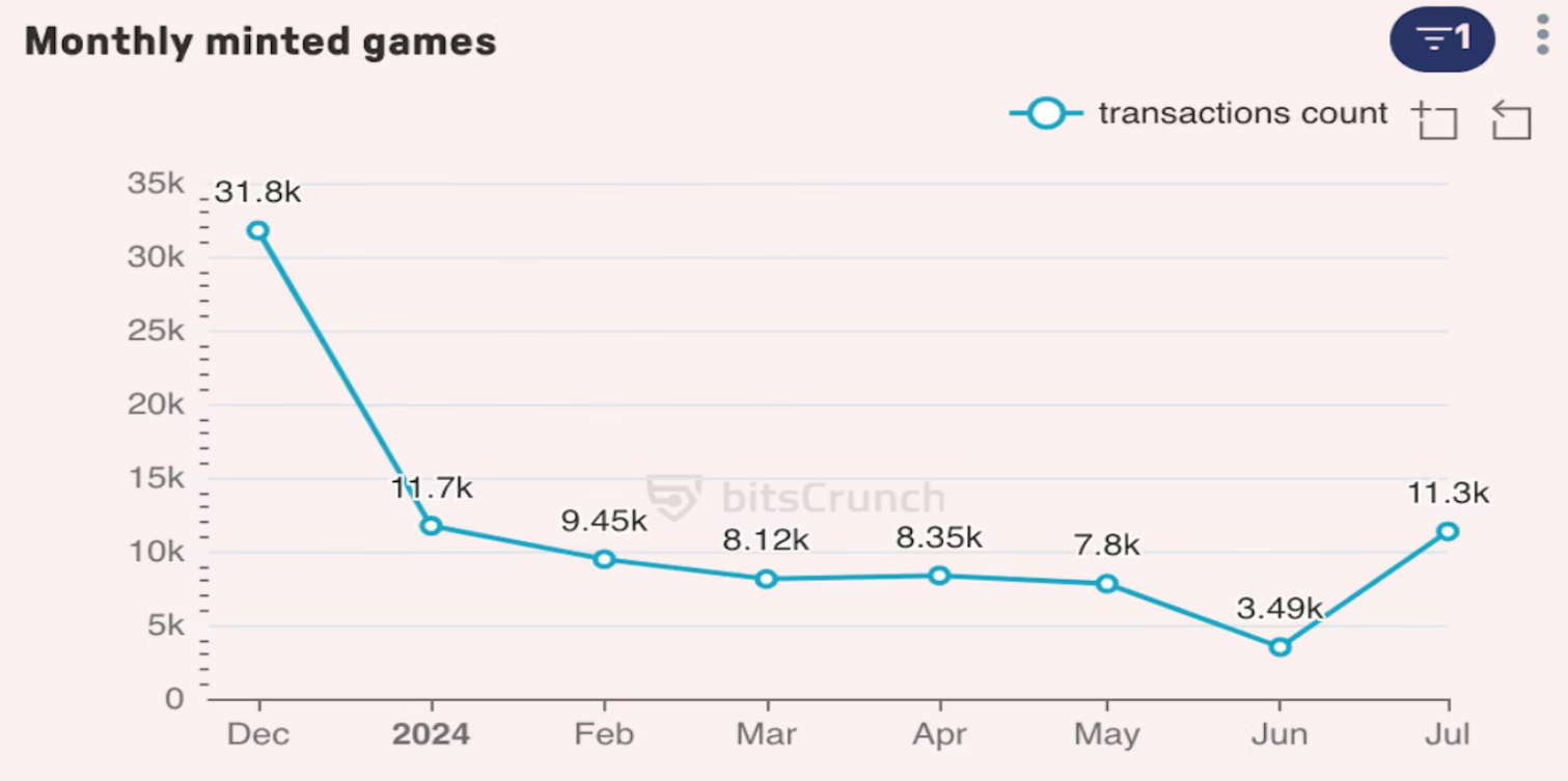 自 2023 年以来,Web3 游戏的玩家数量逐渐下降。玩家基础从 2023 年的 603 万人缩减到目前大约 100 万月活跃用户。