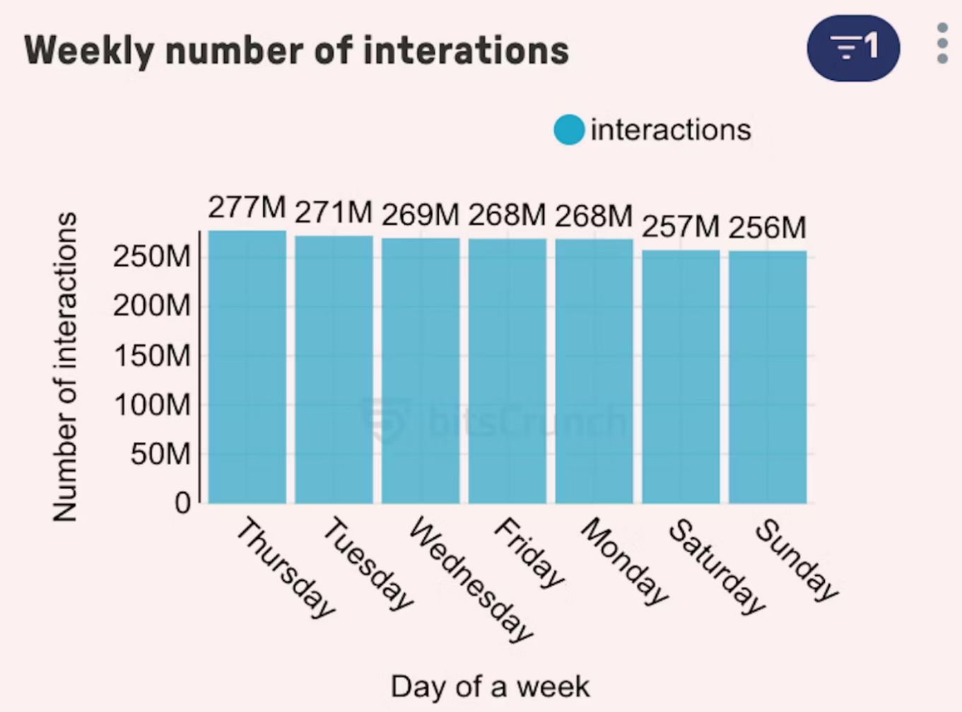 每周的模式显示,星期四是链上交易最活跃的日子,平均约为 2.77 亿次,其次是星期二和星期三。周末的活动明显较低。