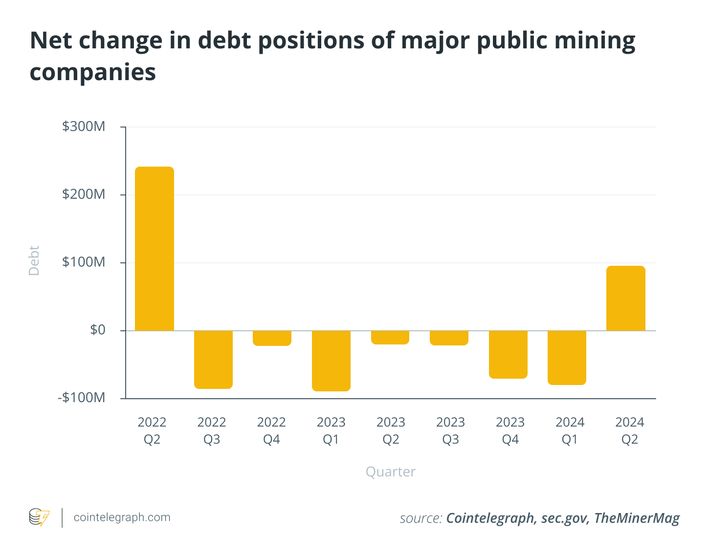 2022 年的加密货币寒冬导致主要的比特币矿工因过度依赖债务融资而申请破产。大多数上市矿工的债务与股本比率超过四,而超过二通常被认为是不可持续的。从 2022 年第三季度开始,比特币挖矿行业开始清理贷款。唯一的例外是 2024 年第二季度,由于对 Hut 8 的 1.5 亿美元投资,使得该季度的数据有所偏差。