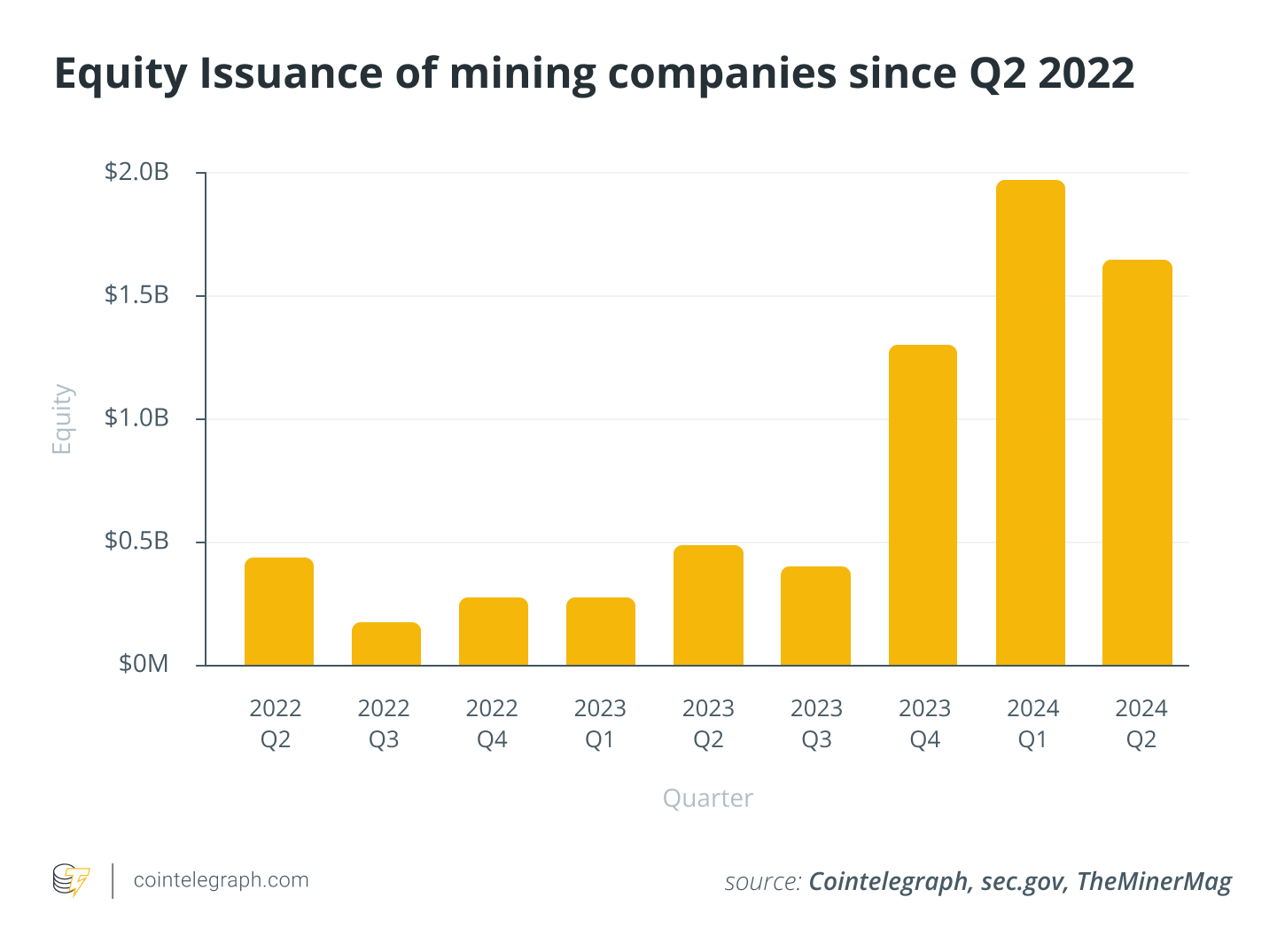 自 2023 年第四季度以来,矿业公司越来越多地通过发行股票来为其运营融资。从 2023 年第三季度到 2024 年第二季度,筹集了超过 49 亿美元,比前三个季度多出 300%。最大增幅出现在 2024 年第一季度,筹集了近 20 亿美元。